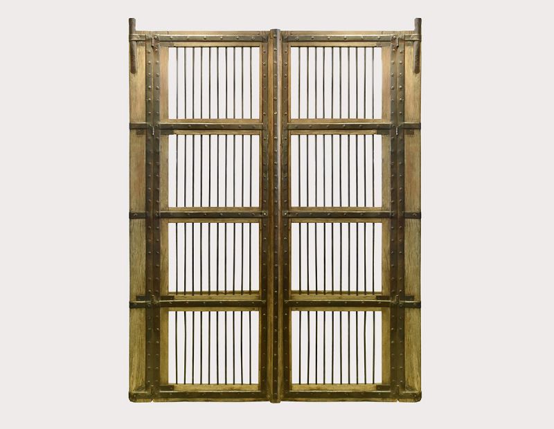 A pair of tall Indian hardwood and metal dog gates. Wrought iron metal work and rivets.