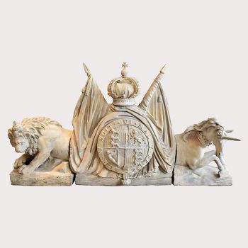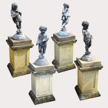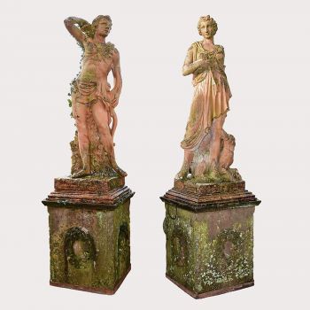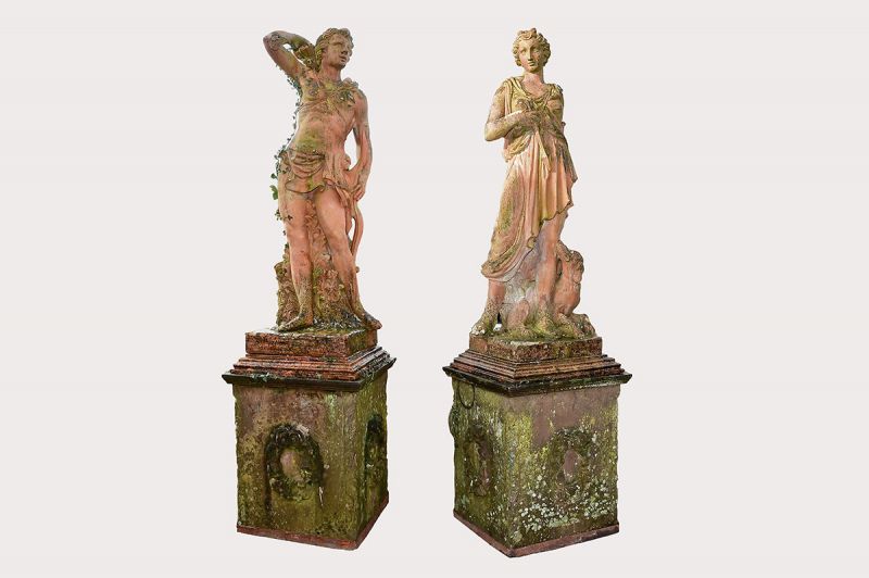 A fine pair of Italian statues of great scale of the twins Artemis and Apollo, in terracotta on substantial solid stone square bases with high relief oval garland decorations on each side.