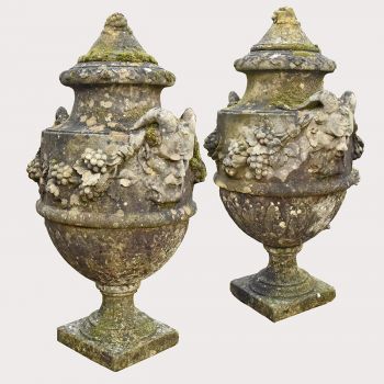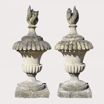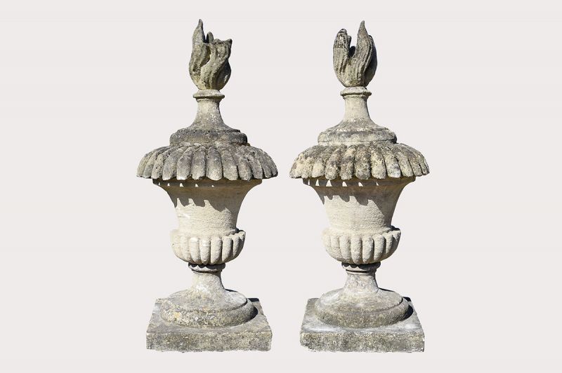 A pair of late Regency stone finials with impressive semi-lobed detailing. Beautiful weathering, adding more depth to decorative lids and flames.