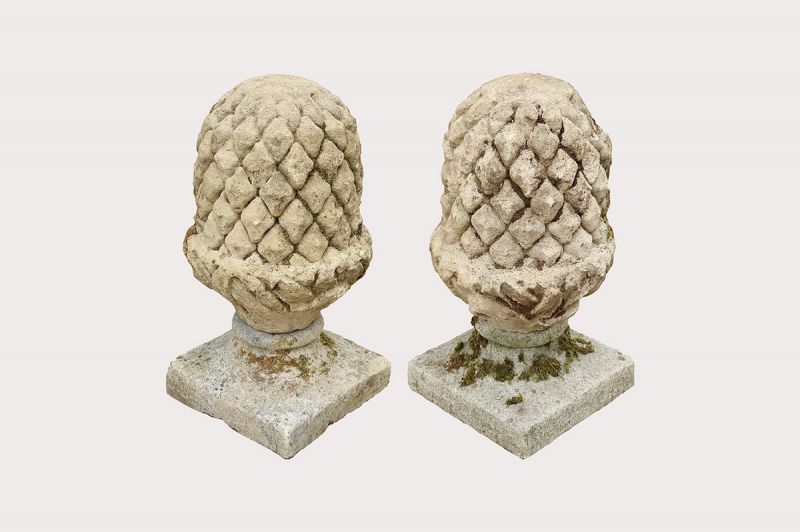Super hand carved pair of Limestone pineapple finials of good scale on square bases. Attractively weathered.