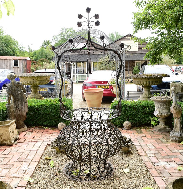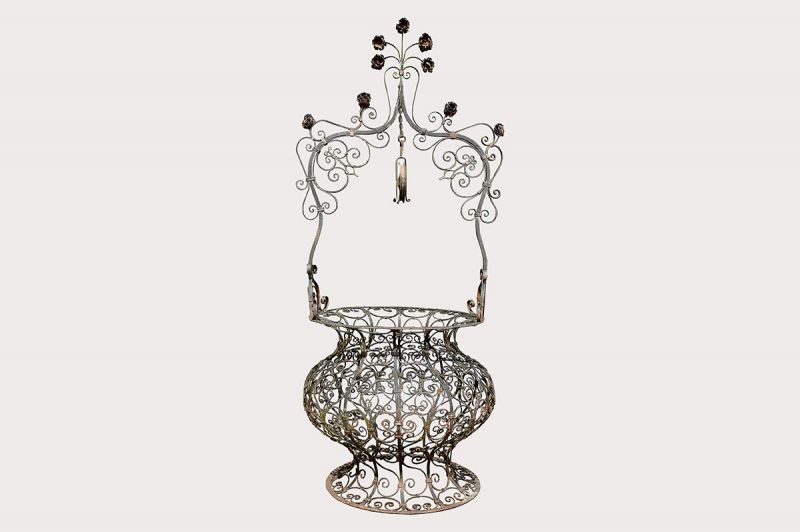 A fine and highly decorative late 19th/early 20th century balustrade design wellhead, blacksmith made with pretty rosette adornments together with original pulley wheel.