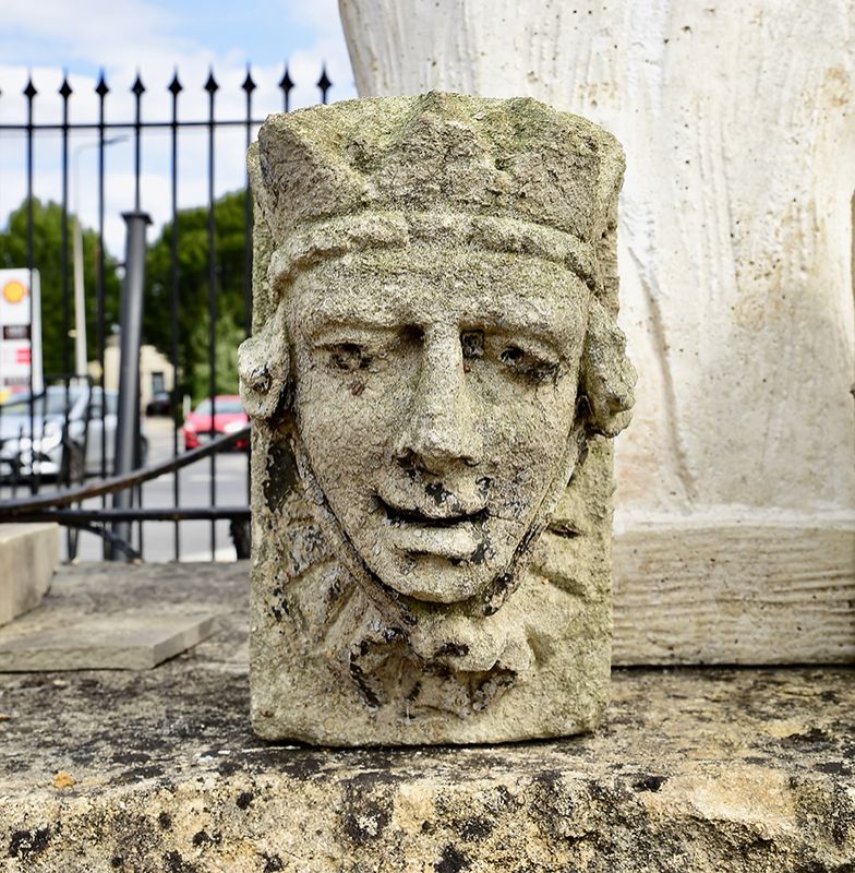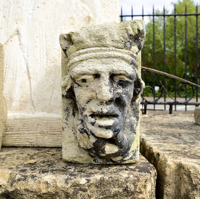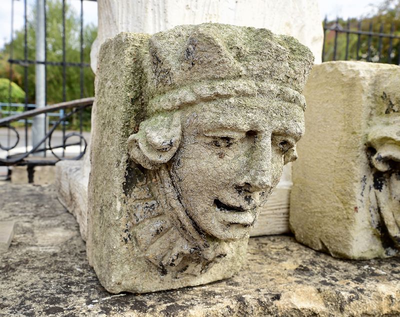Four ecclesiastical carved heads. Keystones, late 18th century. Most likely used around a roofline or entrance porch.
