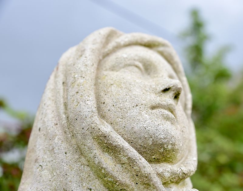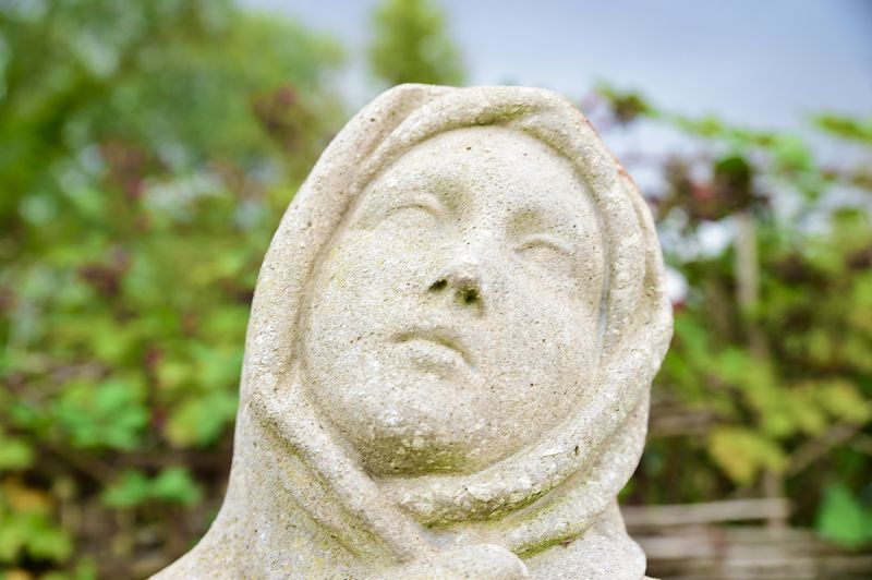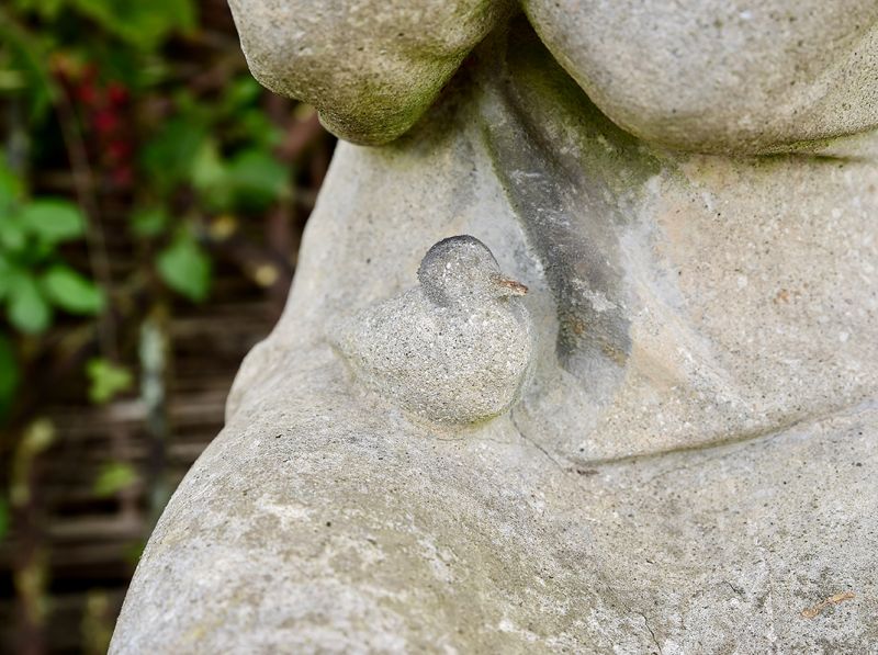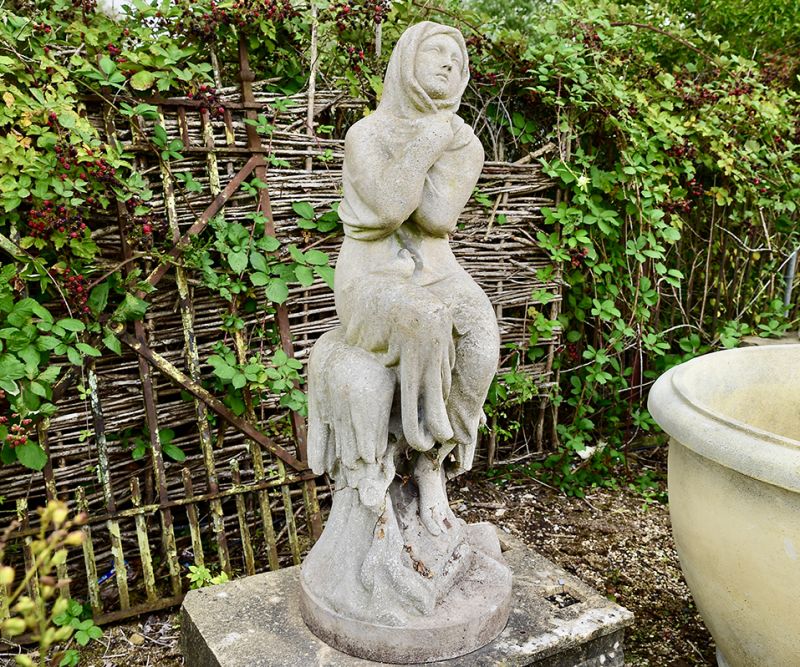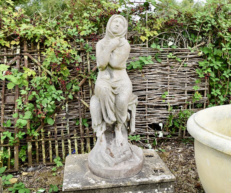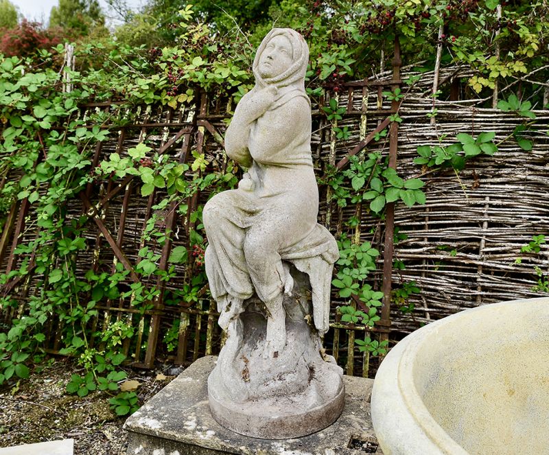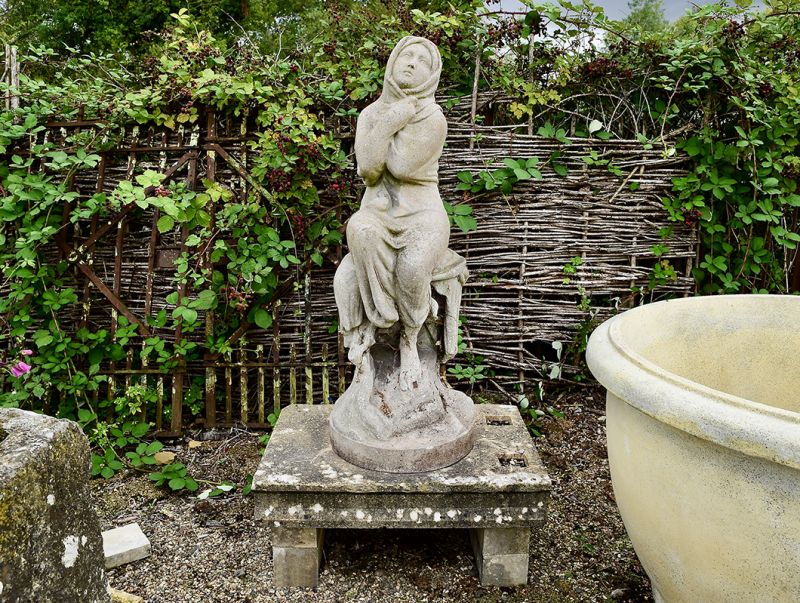 A figure of 'winter', by Austin & Seeley, depicting a girl wrapped tightly in her outer garments looking skyward. She has a small bird nestled in her lap. Great quality.