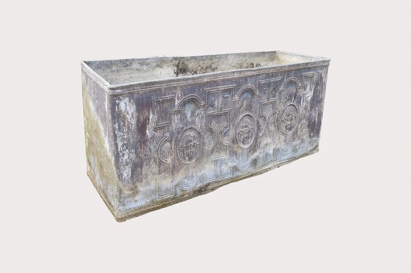English Lead cistern with super detailing, dated 1750, of terrific scale. A cistern of rare length decorated with fretwork circles and roundels featuring flower motifs. A very beautiful 18th century piece.
