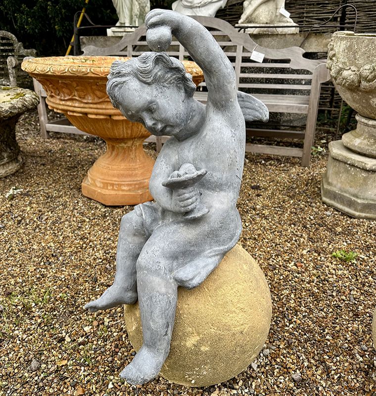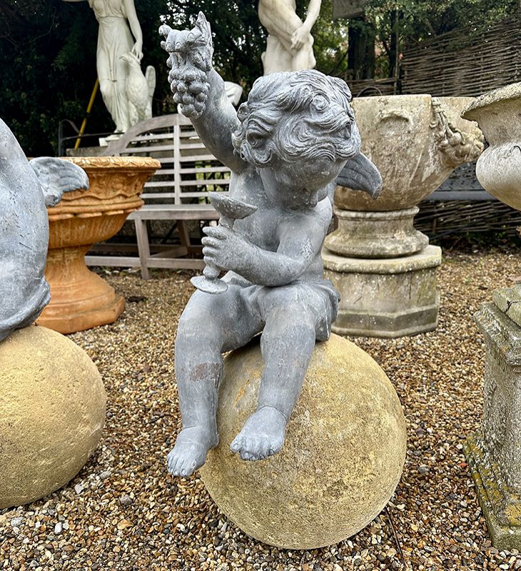 A pair of Lead Putti on sandstone spheres. One holding a wine chalice and a cluster of grapes whilst the other appears to have a plate full of fruit, holding up a pear.