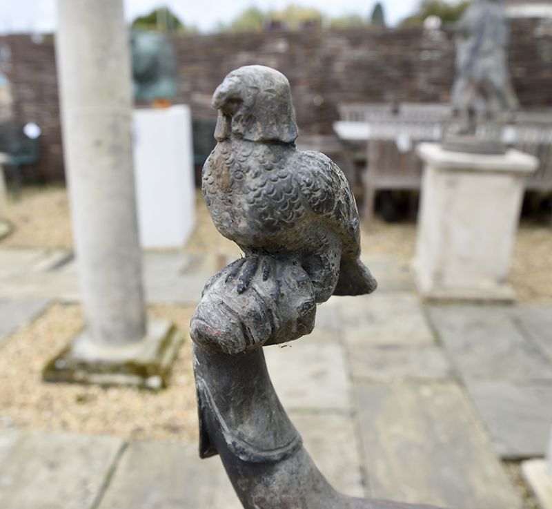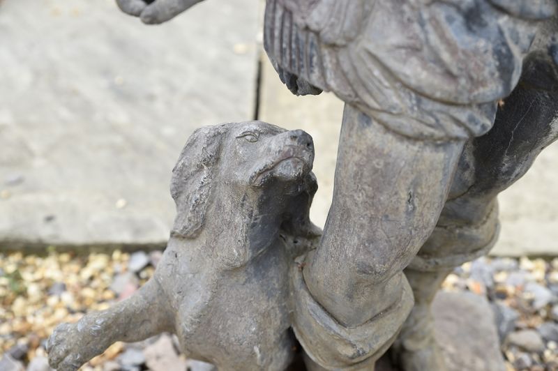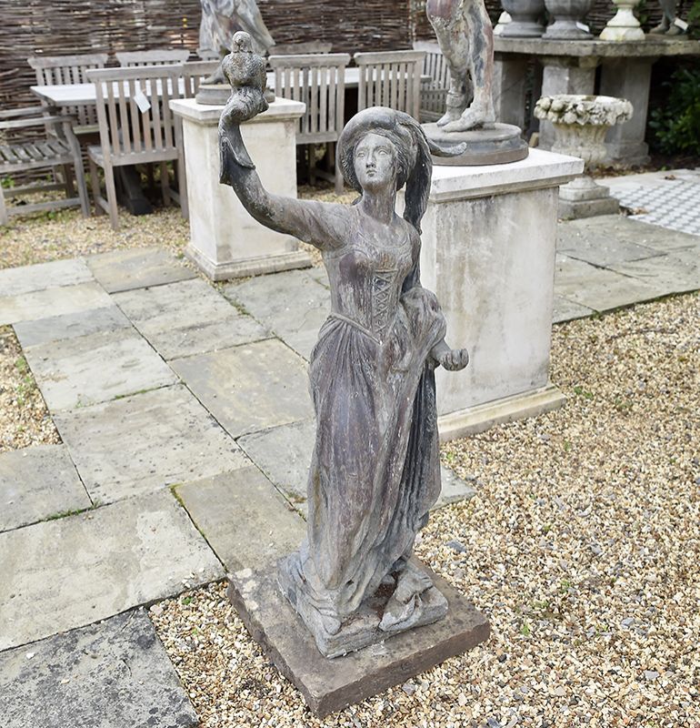 A charming pair of Dutch falconers in lead, 18th century, with fine detailing. The gentleman complete with dog, releasing a falcon after its prey, the lady holding another hooded bird. On differing sized square lead bases.