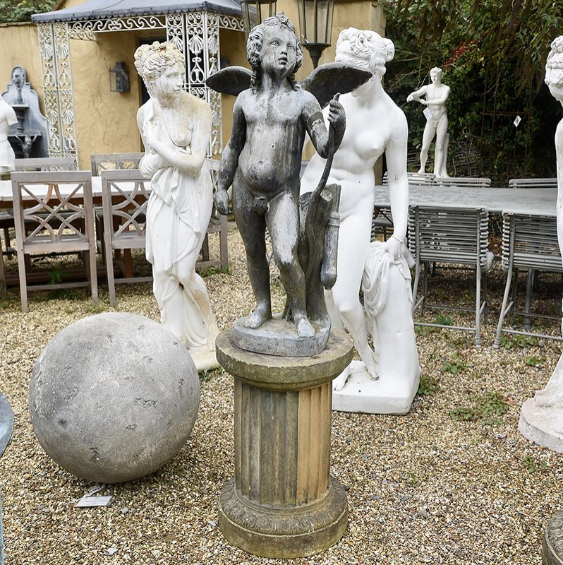 A rare pair of statues in English lead on later fluted columns. A boy holding a hunted hare with a companion, Cupid, the Roman God of love complete with wings and arrow.