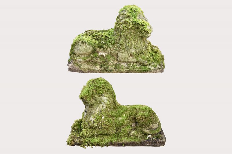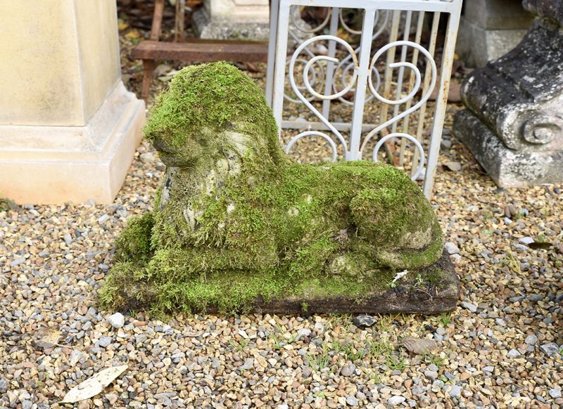Modest sized pair of (exceedingly) mossy recumbent lions. Composition stone, 20th century.