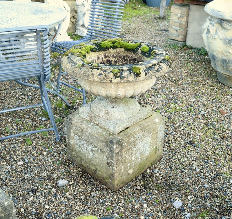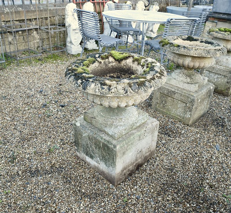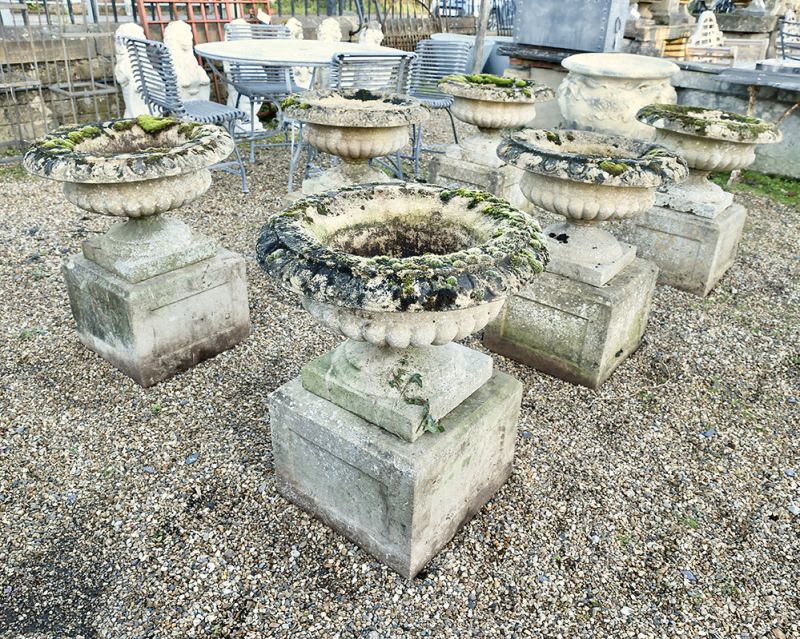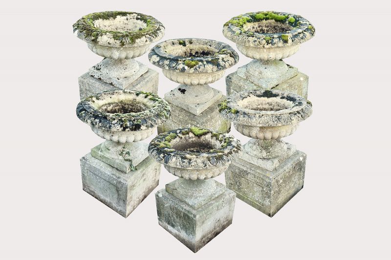 How fabulous to have received six matching urns. Semi-lobed on substantial panelled stone bases these composition stone urns have egg and dart rims and are in great condition with super colouring. The weathering belies their age.