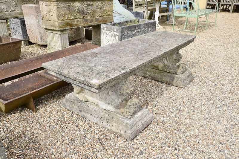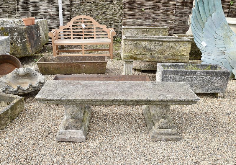 Late 20th century composition Portland stone garden seat on lion supports holding balls between their paws.