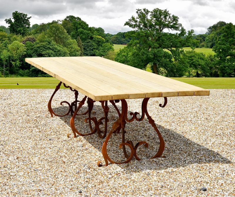 Bespoke hand made table made from kiln-dried oak on a hand forged solid steel scrolled base. A bespoke Garden Art piece. 3.0m x 1m £ 2,650 + Vat