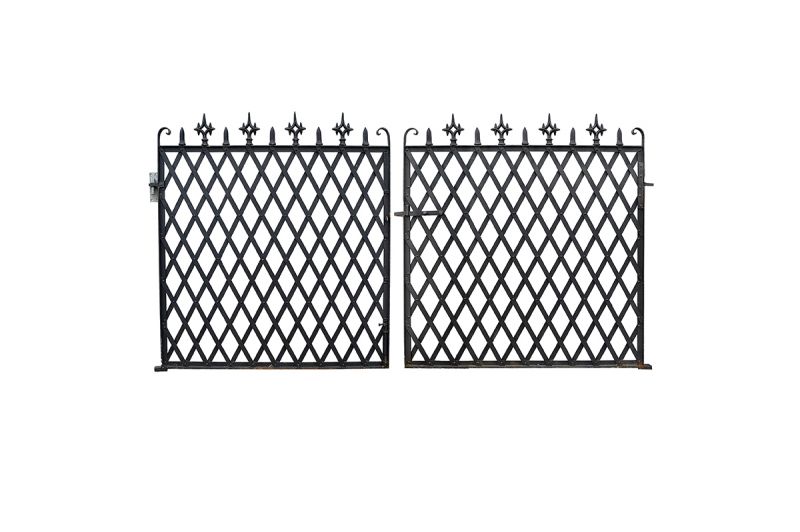 A pair of wonderful wrought iron trellis patterned gates with working latch and decorative finials. 19th century.