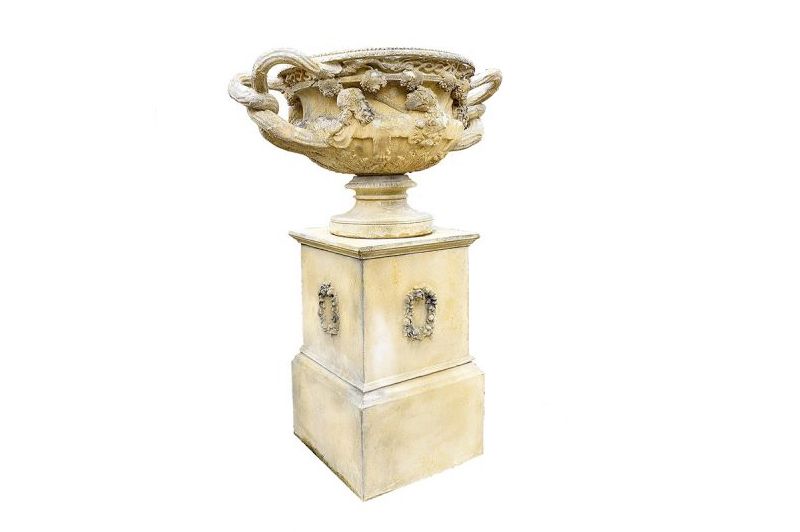 A replica of the ancient Roman vase discovered at Hadrian's Villa, Tivola, in 1771. The body is modelled with classical heads in high relief and the handles to either side are beautifully intertwined.