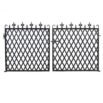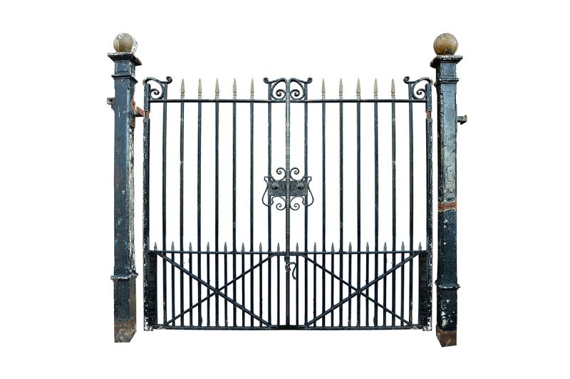 Wrought iron entrance gates with solid posts topped by ball finials. Attractively finished with scrolls and gold detailing.