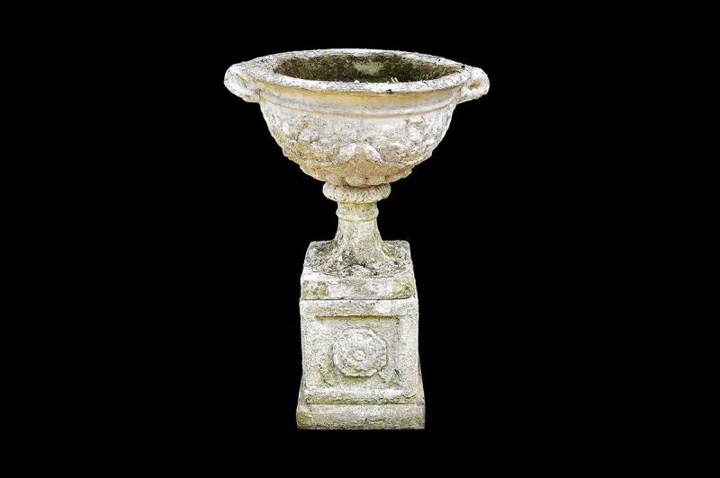 This pretty urn sits on a square plinth decorated with a laurel wreath on each side. It has a patterned rim, two handles and a heavily decorative body. Made from composition stone it has been painted white at some point of it's life.