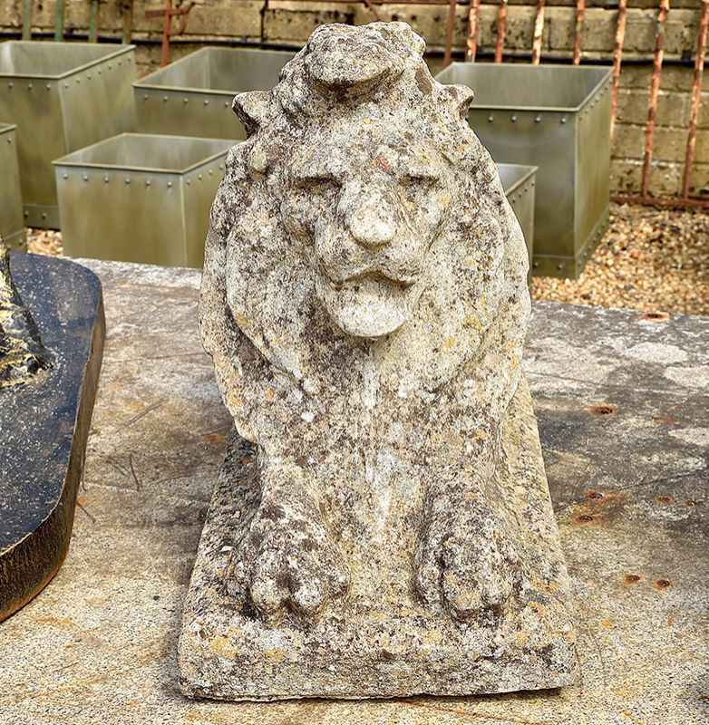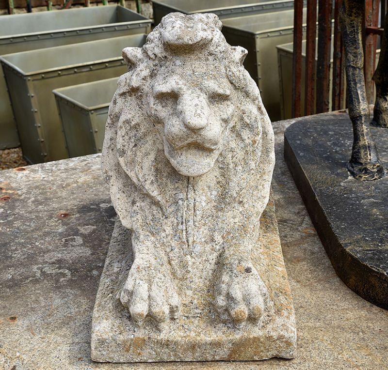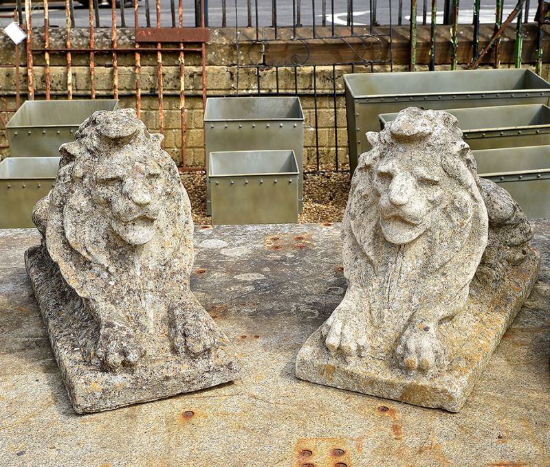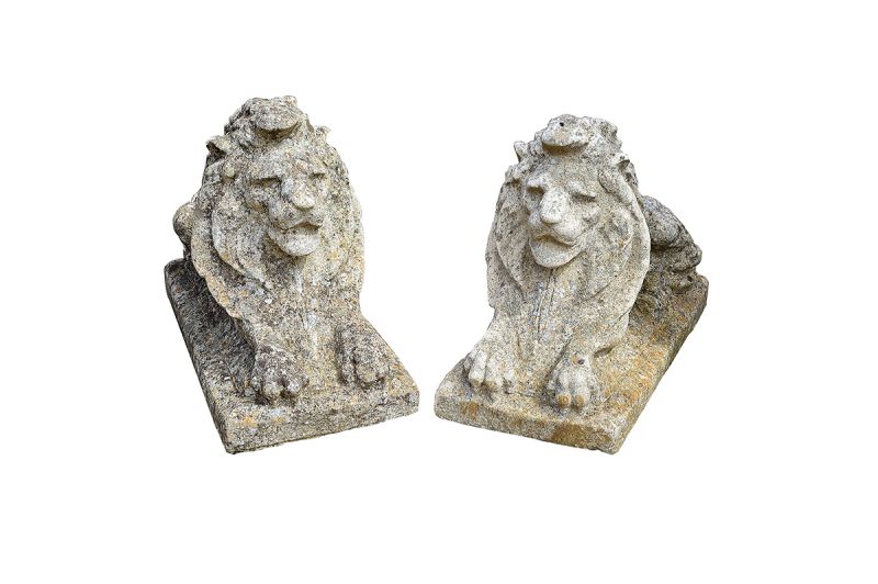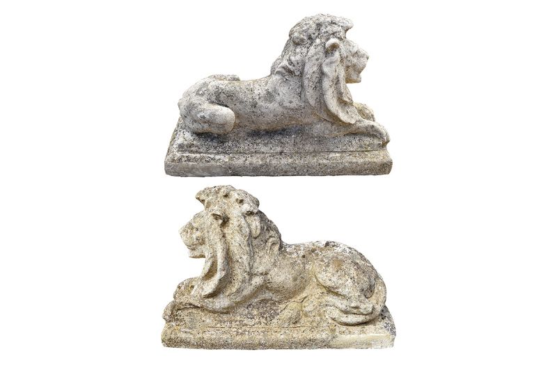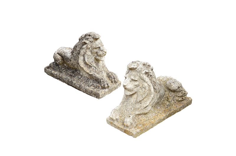 Pair of mid century recumbent lions made out of composition stone. Great weathering. A handed pair.
