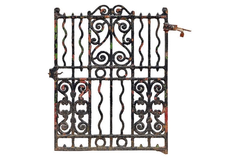 A wrought iron garden gate with scroll detailing, vertical bars and circles. 19th century.