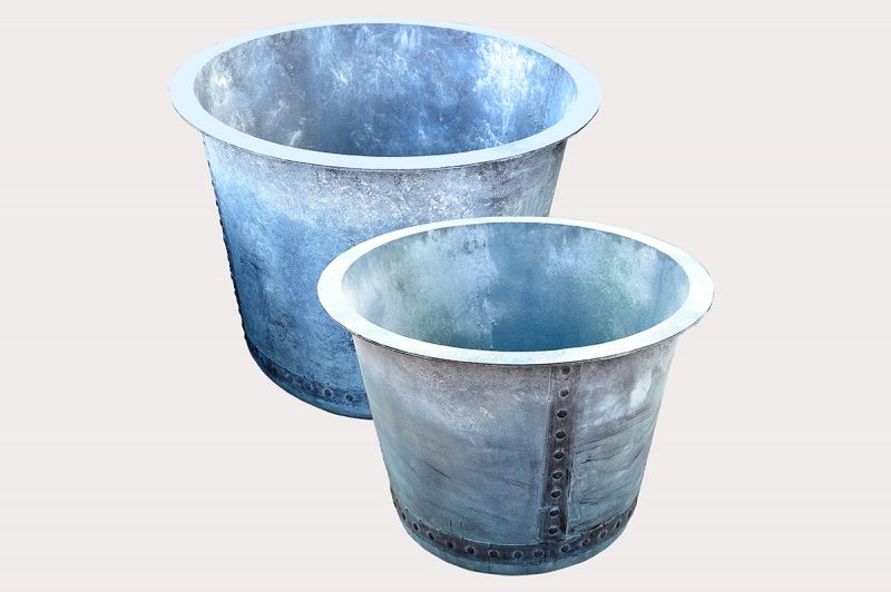 Made from metal with a verdigris copper finish. Wonderfully strong & versatile. They can be drilled with holes for planting or be left and used as wonderful water features. In stock.