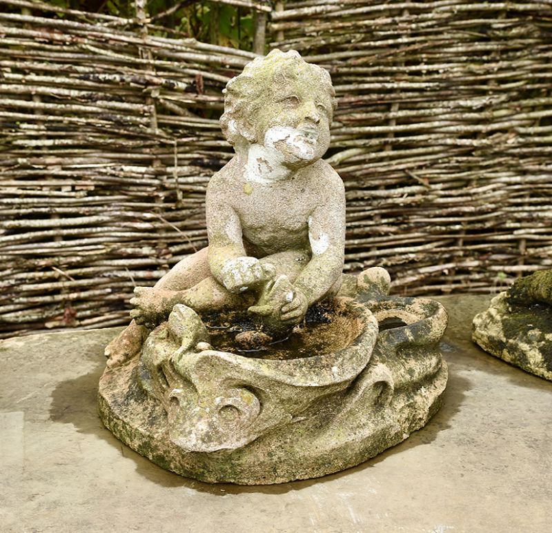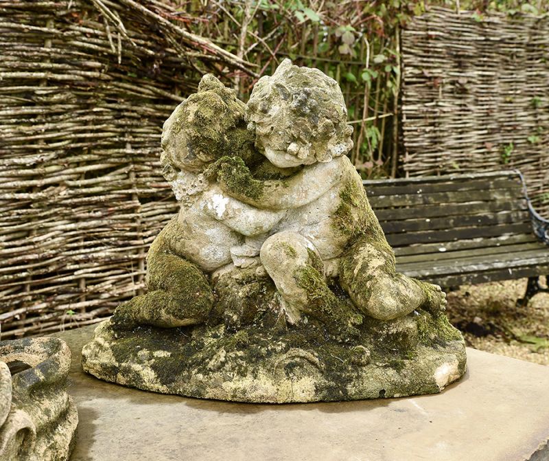 A set of early 20th century wrestling cherubs. Cast from composition stone. Heights 47cm - 60cm Width 33cm - 66cm Depth 40cm - 54cm