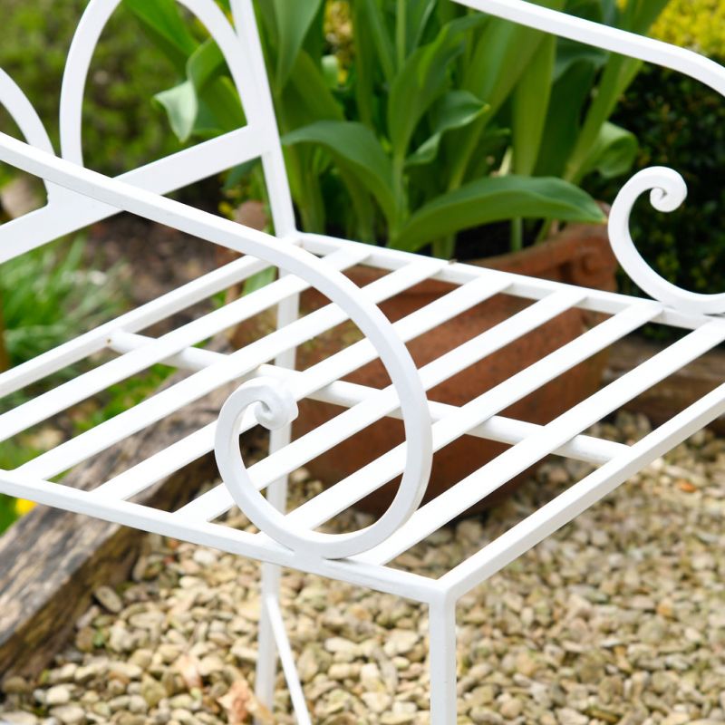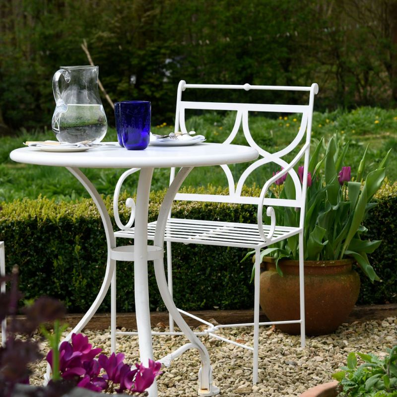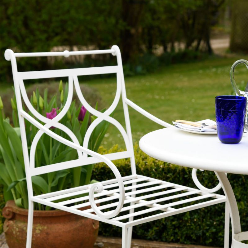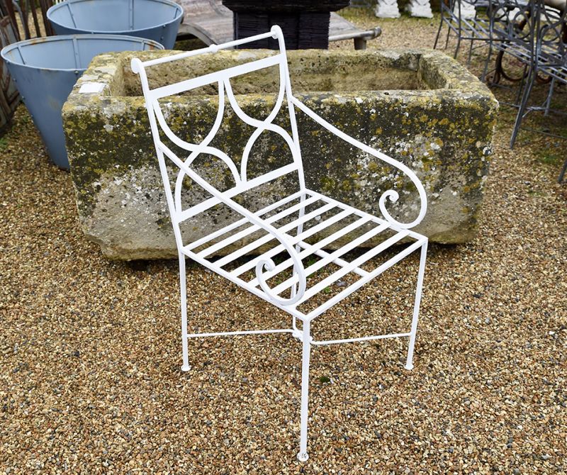 Our classic scroll chair powder coated in off-white with its scroll arms and distinctive patterned back. Please enquire. These chairs can be painted in any colour.