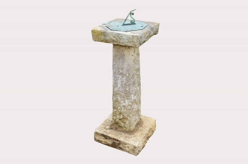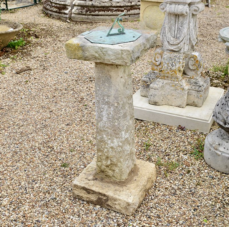 Octagonal bronze sundial plate with a scroll gnomon on a beautifully carved stone base. The sundial was a gift dated 1930.