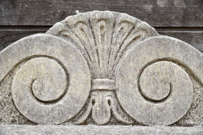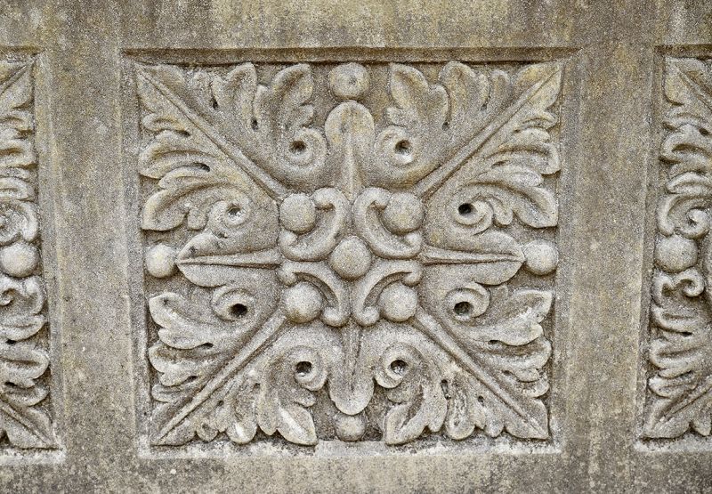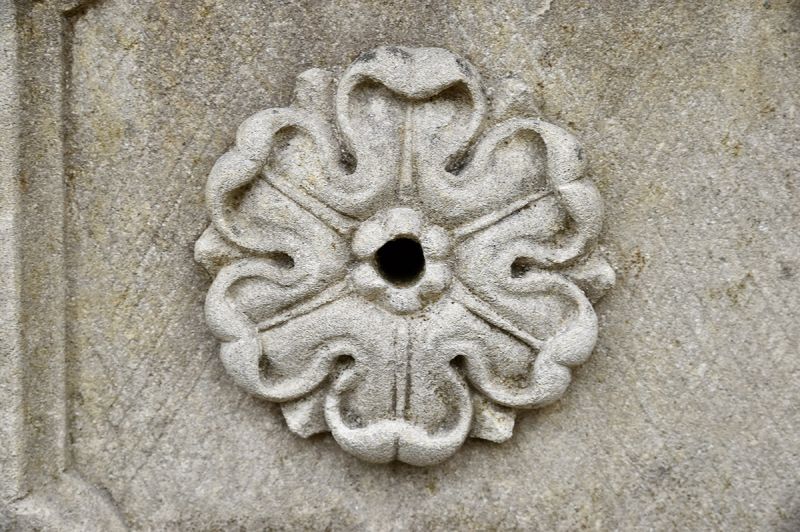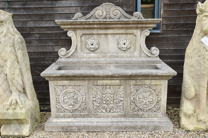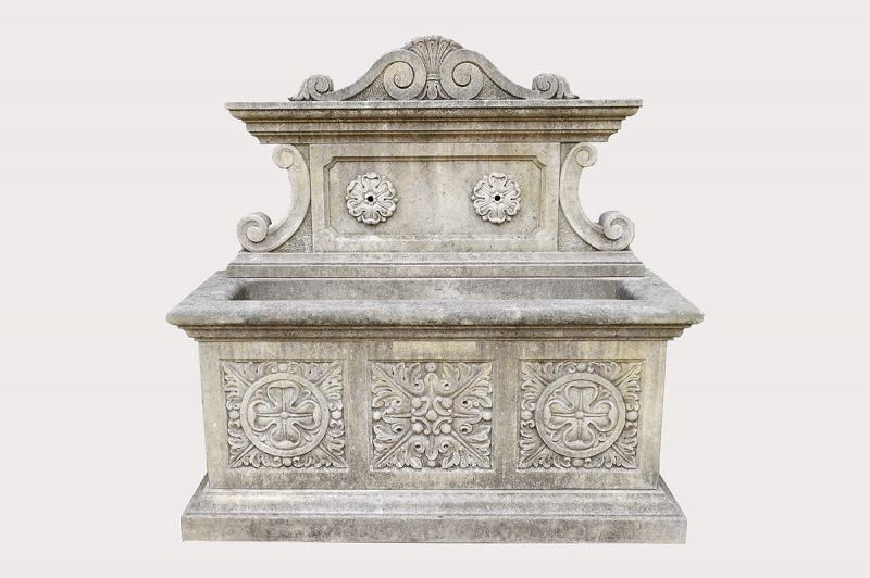 Ornate carved wall fountain with terrific scrolls and a highly patterned front panel. There are two rosette water spouts.