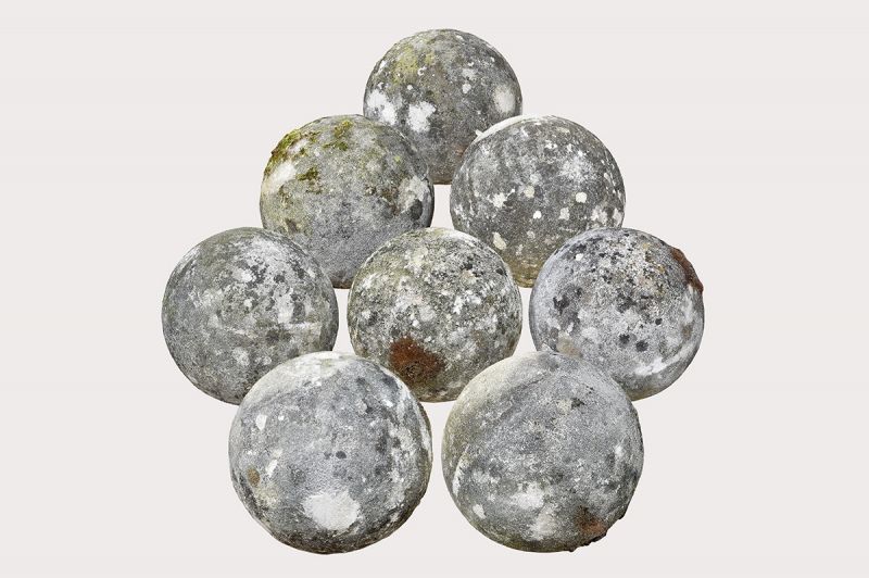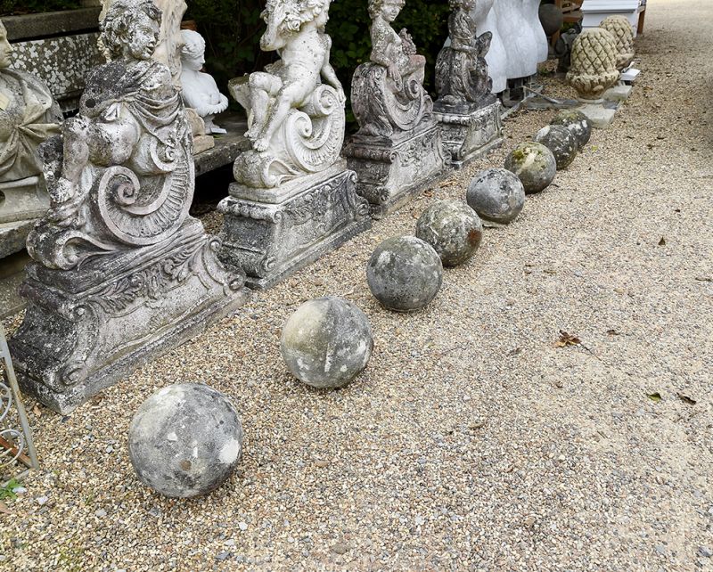 A fabulous set of composition Portland Stone balls, early 20th century. Really attractive weathering. The spheres are one foot in width/diameter.