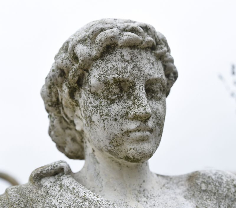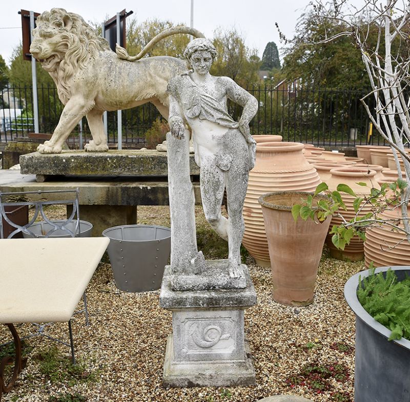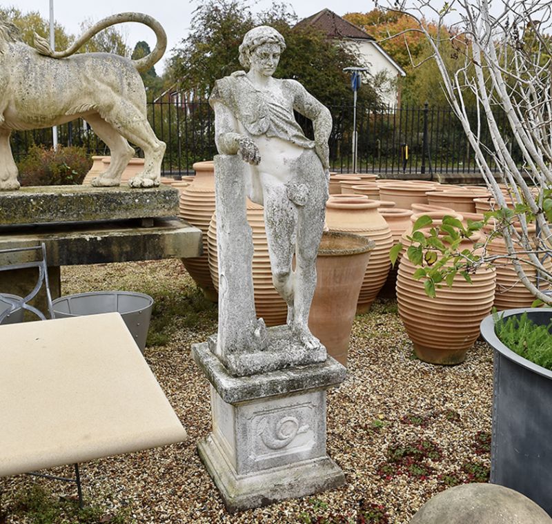 A 20th century composition marble statue of Pan. Nicely weathered statue and base which is decorated on front and back with a circular trumpet horn.
