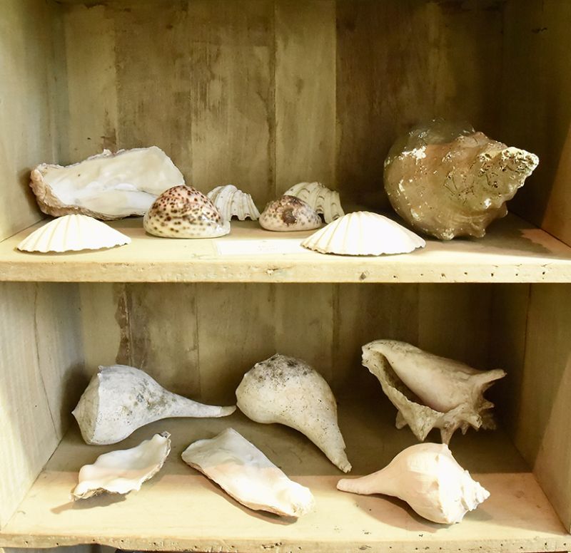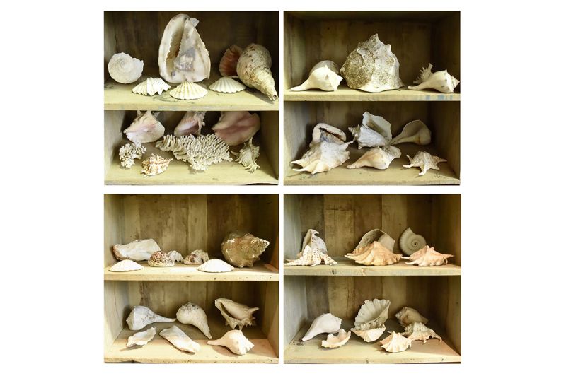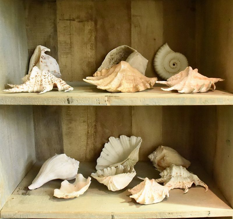 A wonderful collection of shells of varying sizes and types. Among them you will find horse and queen conch, small cowrie shells, as well as two pieces of white coral.