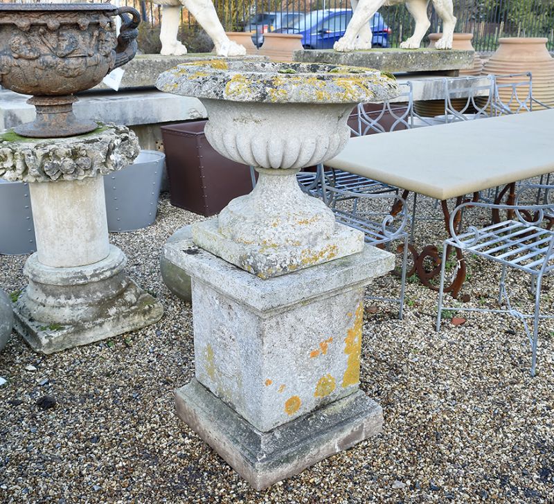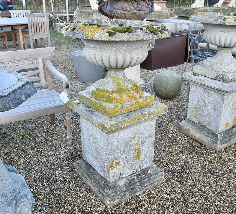 Large pair of composition stone semi-lobed urns on three part pedestals each side detailed with a masks. Flared rims with generous planting area. Mid century.