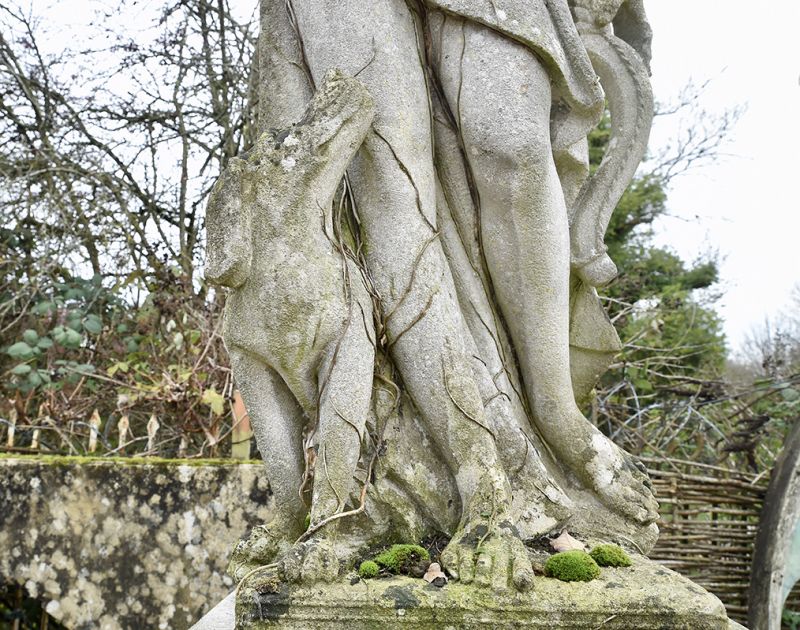 A magnificent statue of Apollo with his bow, quiver of arrows and loyal hound carved from Vincenza Limestone upon an ionic capitol.