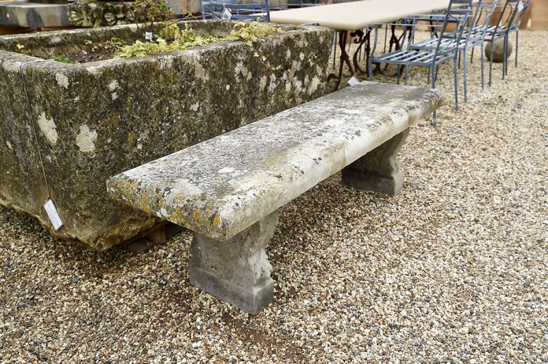 Wonderfully weathered, 19th century stone bench with a substantial Portland stone seat on carved marble supports that are beautifully decorated with acanthus leaf on each side.