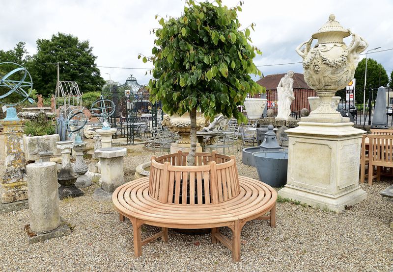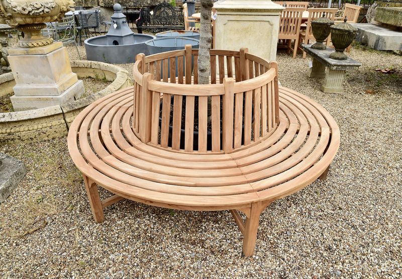 A teak tree seat. Two halves make up this wonderful garden bench. A really super feature. Internal diameter for trunk: 93cm / three feet