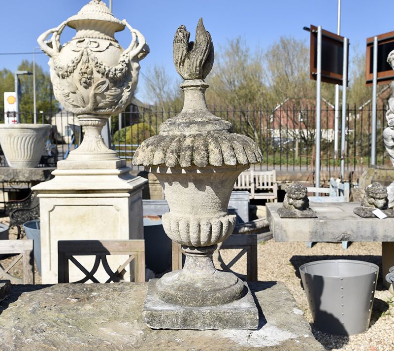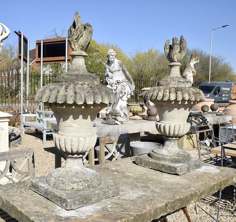 A pair of late Regency stone finials with impressive semi-lobed detailing. Beautiful weathering, adding more depth to decorative lids and flames.