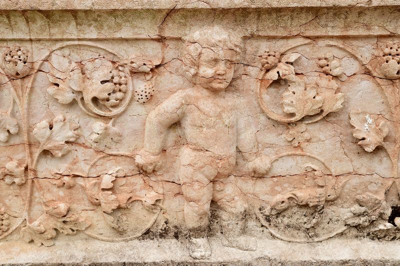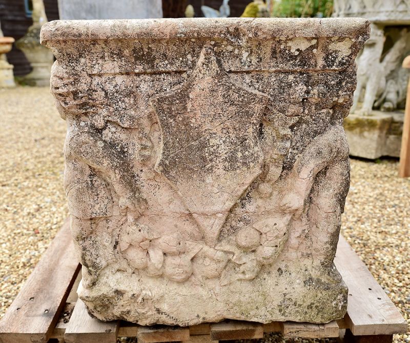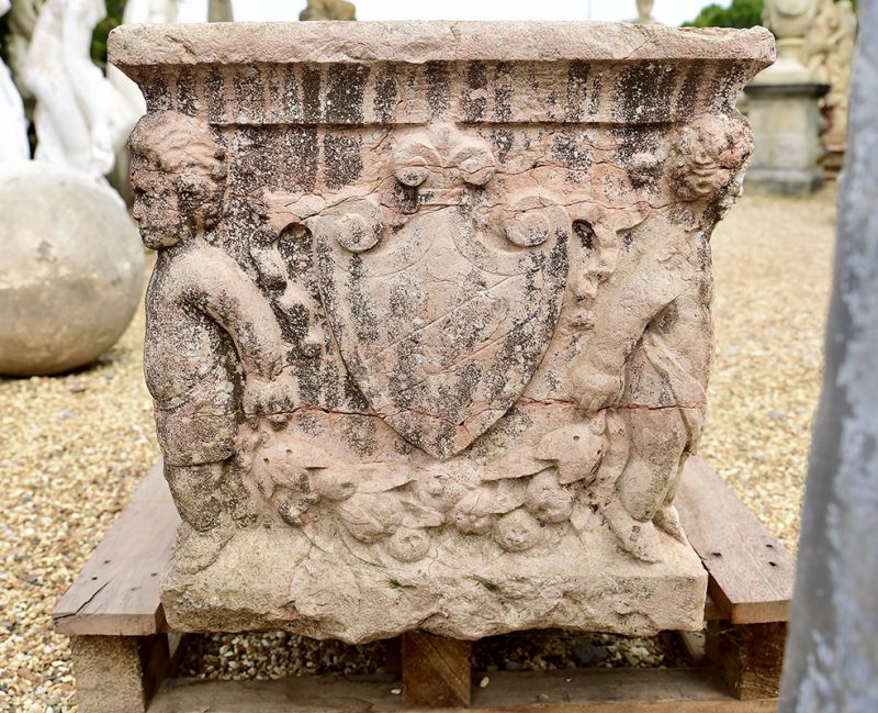 Cherubs carved on each corner and front and back panels and armorial shields at each end with further acanthus leaf decoration.