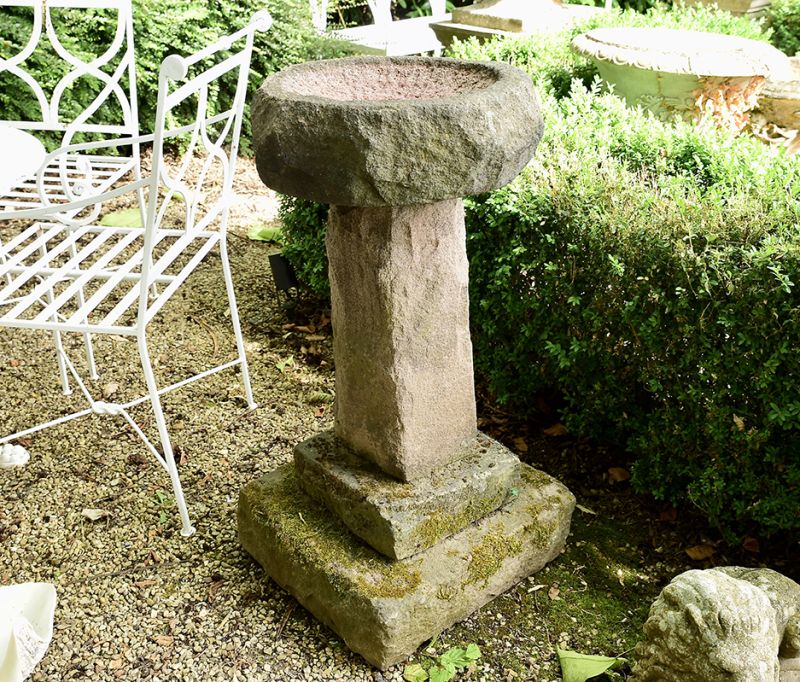 A sizeable, roughly hewn, bird bath with round top and square stepped base. A fabulous carved centrepiece. 19th century.