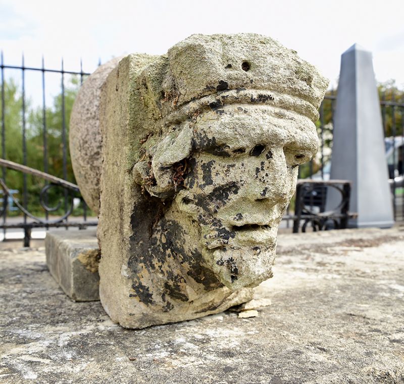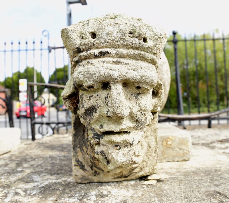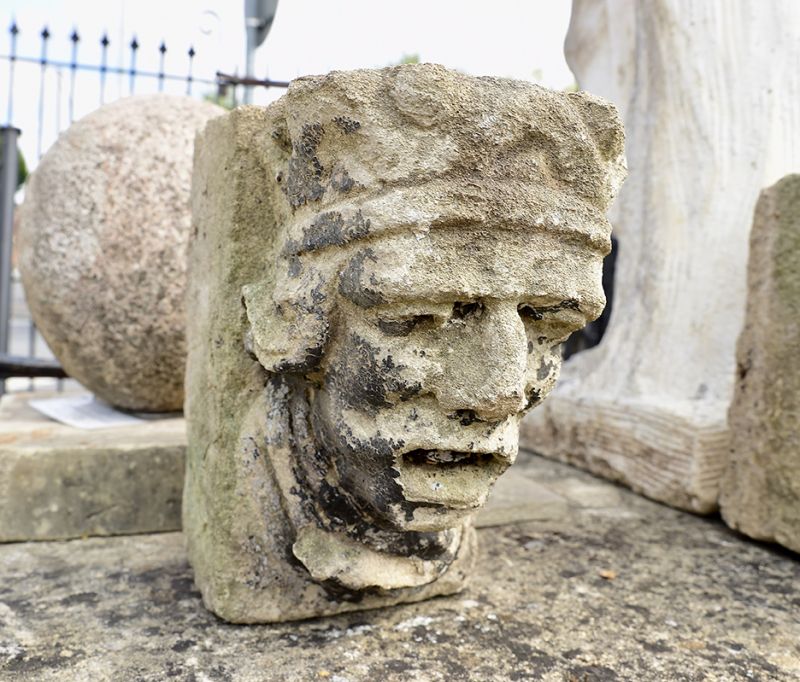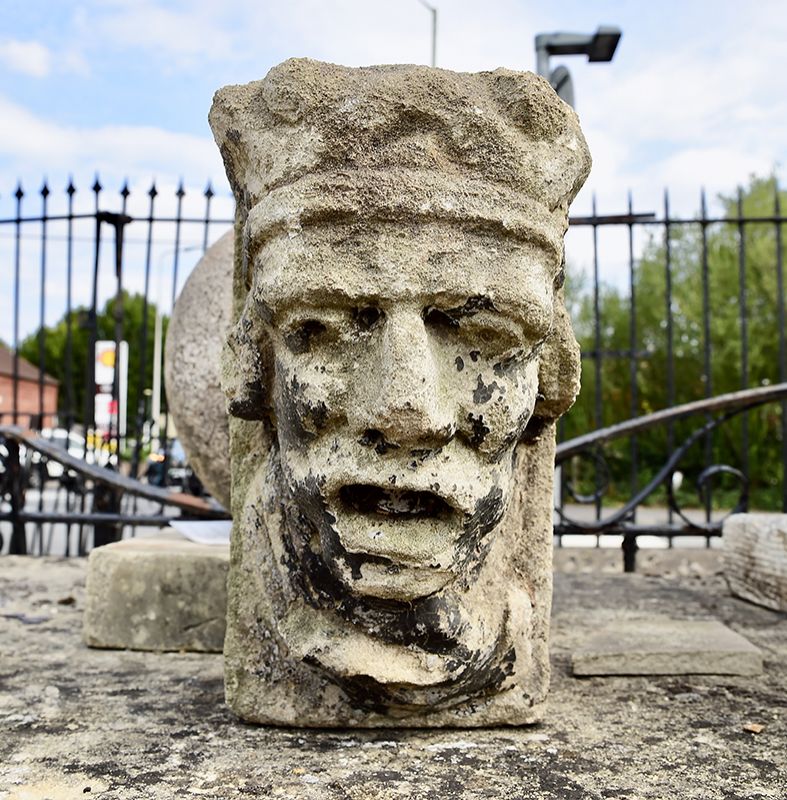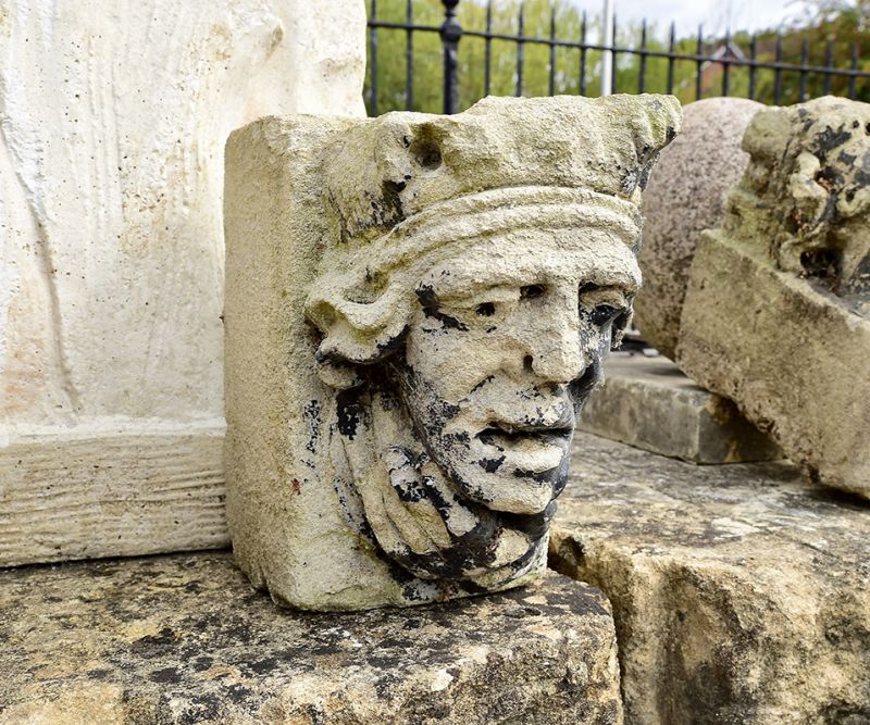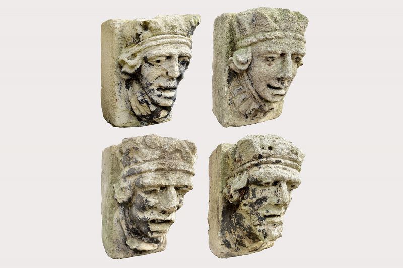 Four ecclesiastical carved heads. Keystones, late 18th century. Most likely used around a roofline or entrance porch.