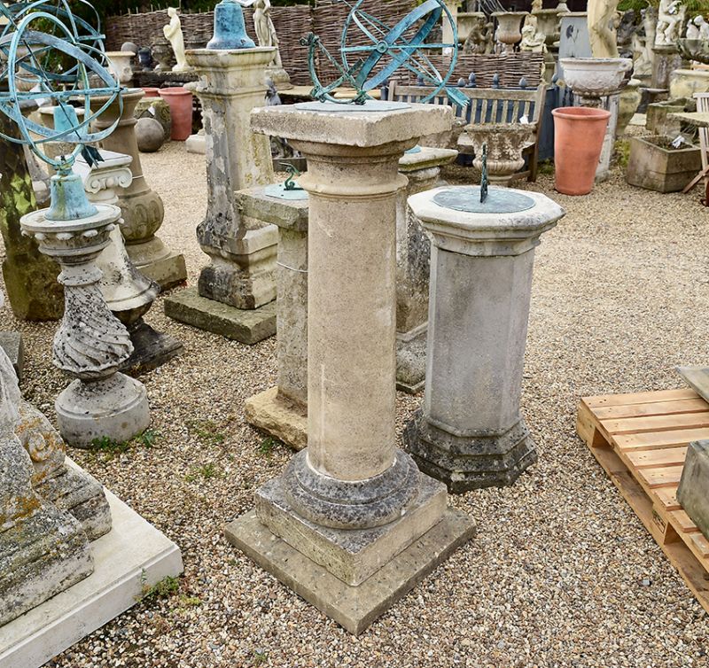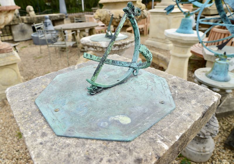 Elaborate bronze horizontal dial with highly decorated gnomon dated 1703 (but 19th century). It also has an enchanting poem engraved celebrating sunny days. Supported on an elegant Bath Stone column pedestal.