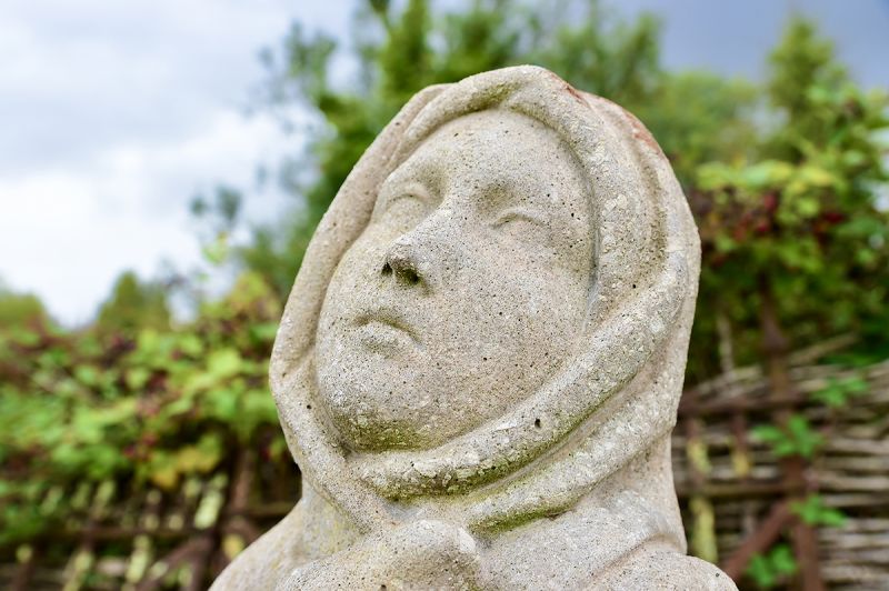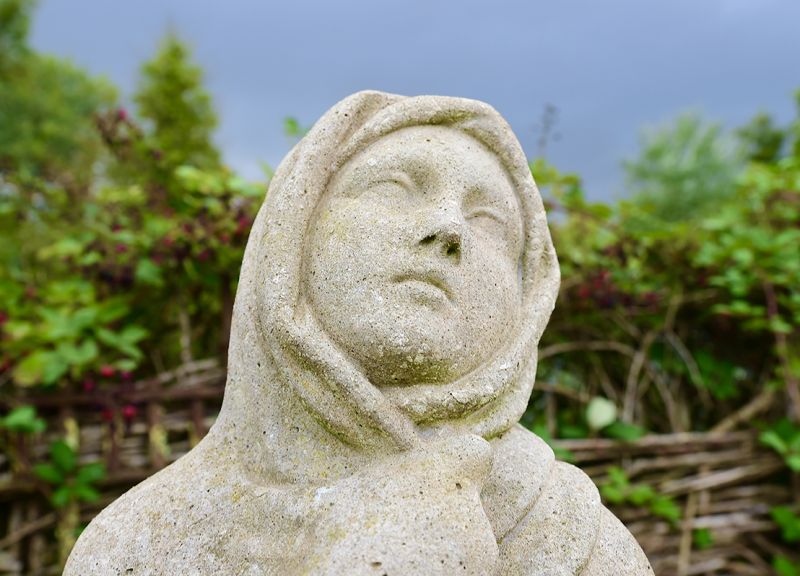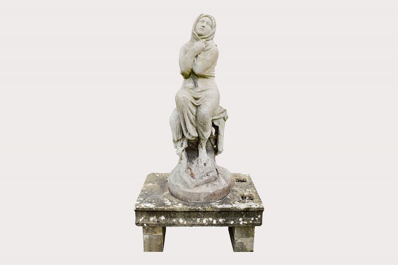 A figure of 'winter', by Austin & Seeley, depicting a girl wrapped tightly in her outer garments looking skyward. She has a small bird nestled in her lap. Great quality.