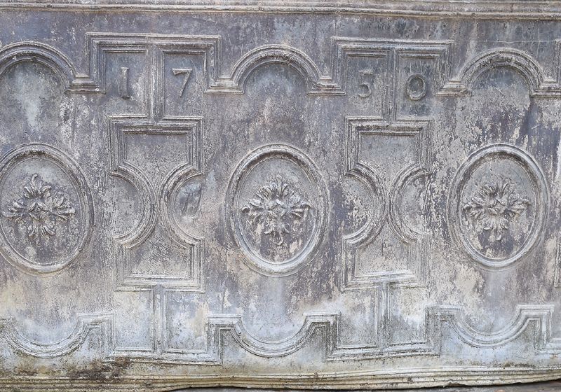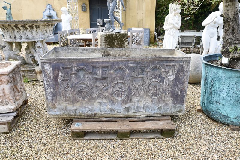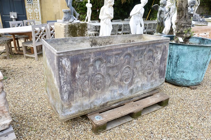 English Lead cistern with super detailing, dated 1750, of terrific scale. A cistern of rare length decorated with fretwork circles and roundels featuring flower motifs. A very beautiful 18th century piece.