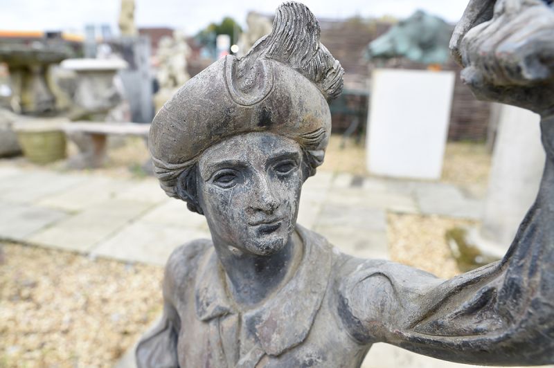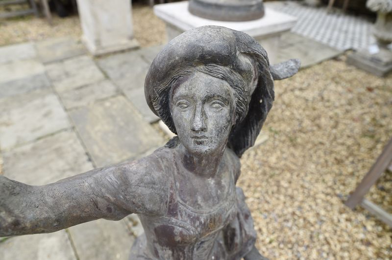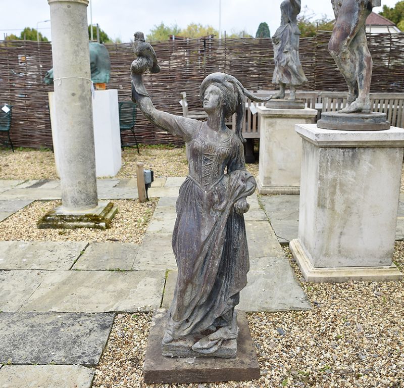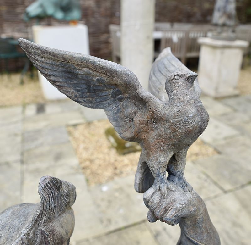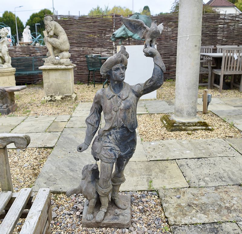 A charming pair of Dutch falconers in lead, 18th century, with fine detailing. The gentleman complete with dog, releasing a falcon after its prey, the lady holding another hooded bird. On differing sized square lead bases.