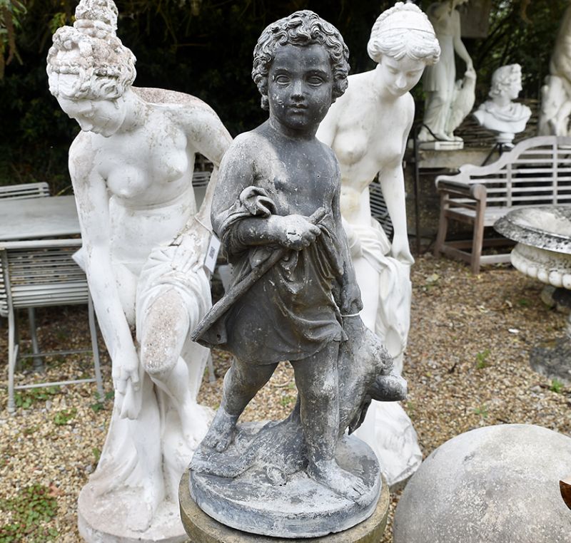 A rare pair of statues in English lead on later fluted columns. A boy holding a hunted hare with a companion, Cupid, the Roman God of love complete with wings and arrow.