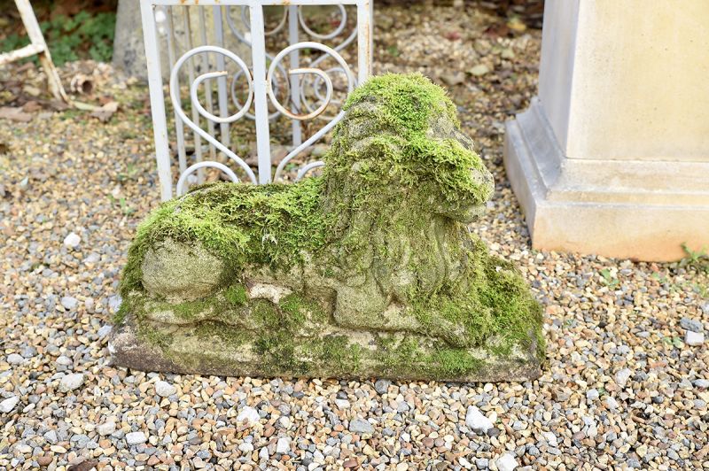 Modest sized pair of (exceedingly) mossy recumbent lions. Composition stone, 20th century.