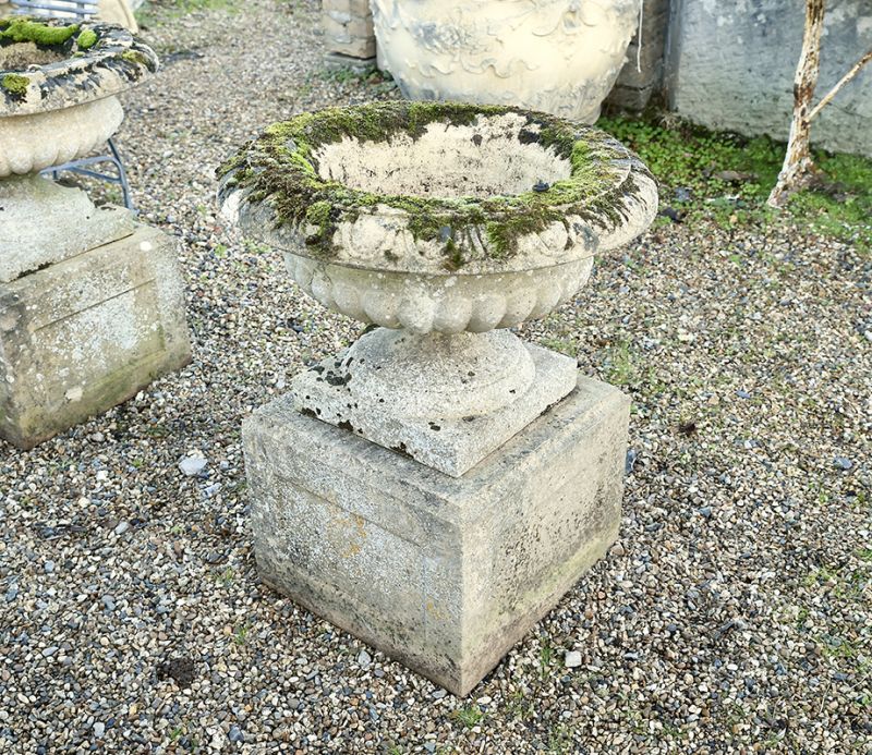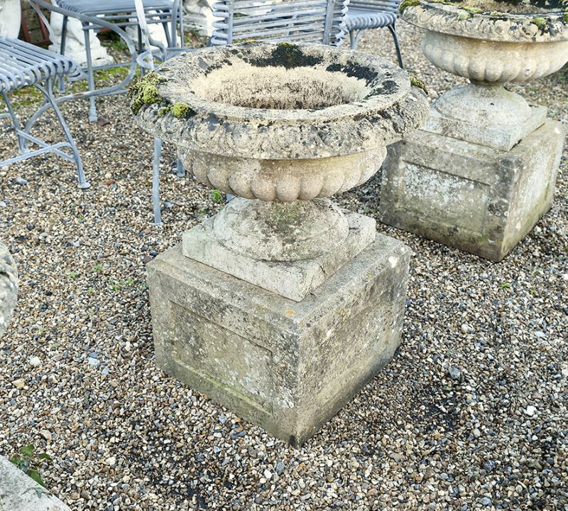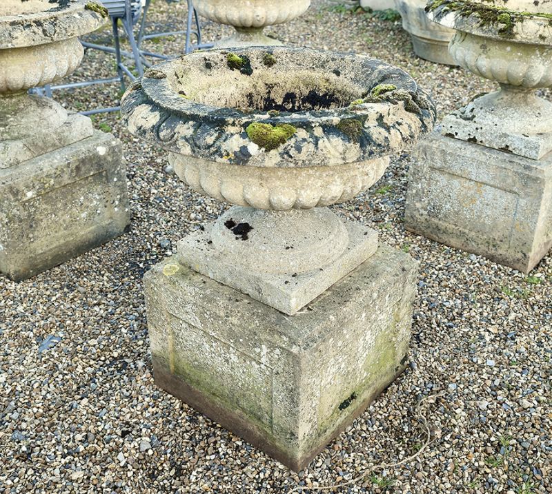 How fabulous to have received six matching urns. Semi-lobed on substantial panelled stone bases these composition stone urns have egg and dart rims and are in great condition with super colouring. The weathering belies their age.
