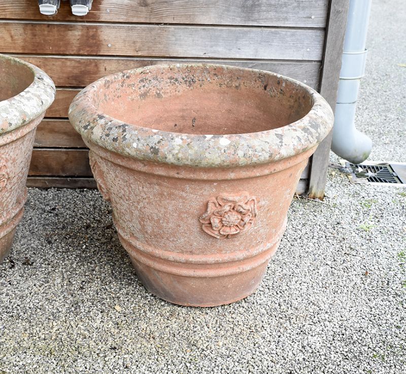 A mid century pair of planters, after Compton, in English terracotta. Beautifully aged. Great condition. Lovely strong pots with thick rolled tops.