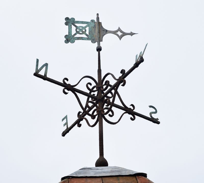 A roof-tiled dovecote surmounted with a magnificent 19th century copper and wrought iron weathervane.
