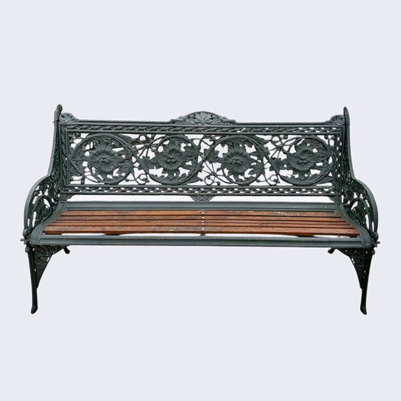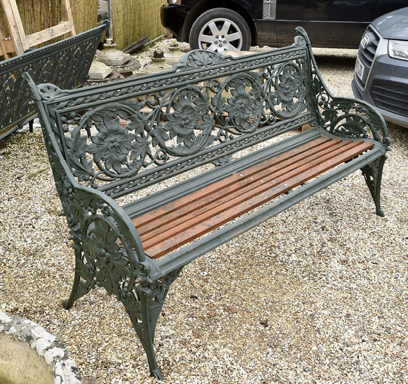 Rare and original Coalbrookdale bench (Registration No. 17568, fully stamped) with a highly decorated back support featuring horse chestnut design.
