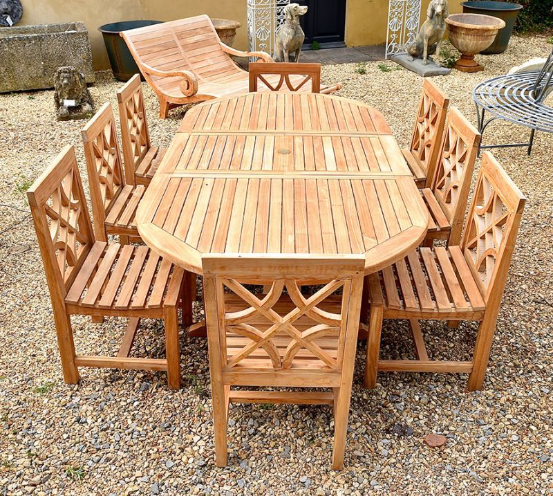 Our 2.4m extendable table seats eight comfortably. Known as the "King of the Woods" teak is both sturdy and durable. Good stocks of the 2.4m. Chairs £ 185 each. GA2854-40.