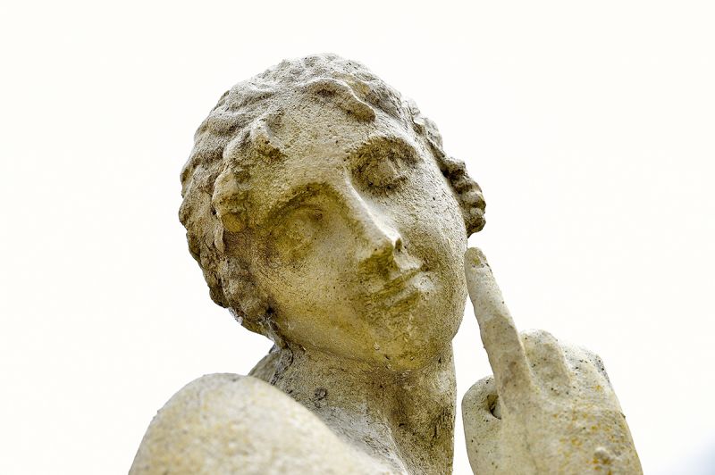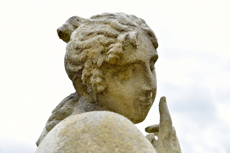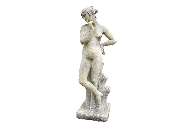 Classical female figure leaning on a log. Composition stone. Late 20th century. We have a weathered version of this statue available. Available to order.