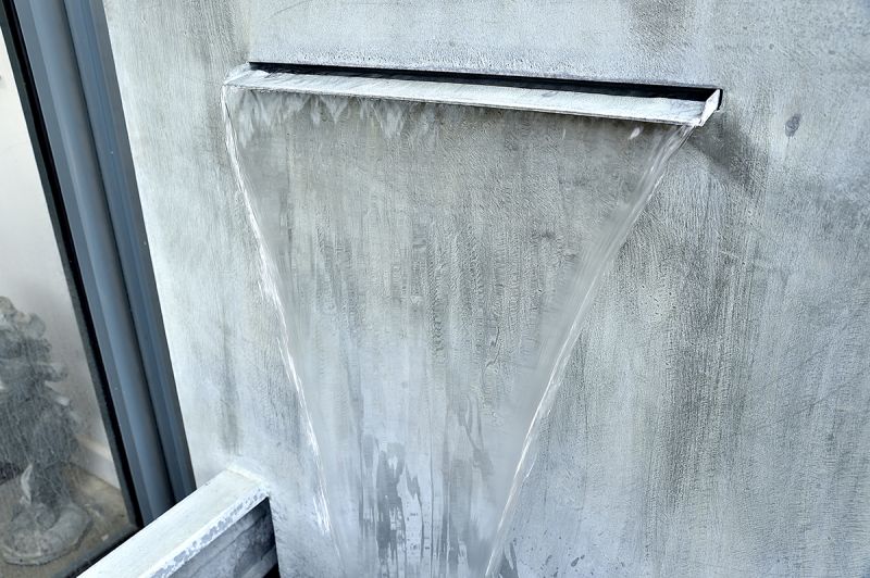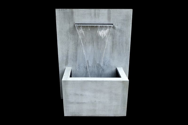 Contemporary galvanised wall fountain with slim letterbox spout. In a pre-weathered finish which will get slightly lighter over time. Completely self contained aside from power.